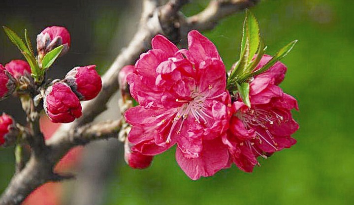 桃花,屬薔薇科,落葉小喬木,高可達(dá)6一8米。樹干灰褐色,粗糙有孔。小枝紅褐色或褐綠色,平滑。葉橢圓狀披針形,邊緣有細(xì)鋸齒?;▎紊?,有白、粉紅、紅等色,重瓣或半重瓣,花期3月。核果近球形,表面密被短絨毛,因品種不同,果熟6一9月。