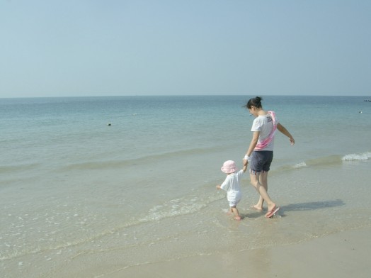 海灘上留下了無(wú)數(shù)指尖大小的小孔隙,出于好奇,我蹲下來(lái)靜靜地觀察,發(fā)現(xiàn)有小小的螃蟹從小孔隙里爬出來(lái),象我一樣好好沐浴燦爛陽(yáng)光、溫暖海風(fēng);有些頂著米粒大的沙團(tuán)推出小孔隙,原來(lái)是小螃蟹寶寶在造穴,多勤勞呀,從小就養(yǎng)成了愛勞動(dòng)的習(xí)慣;最好玩的是好不容易逮著一只螃蟹寶寶放在手心任其橫行霸道,直癢得我開懷大笑……..